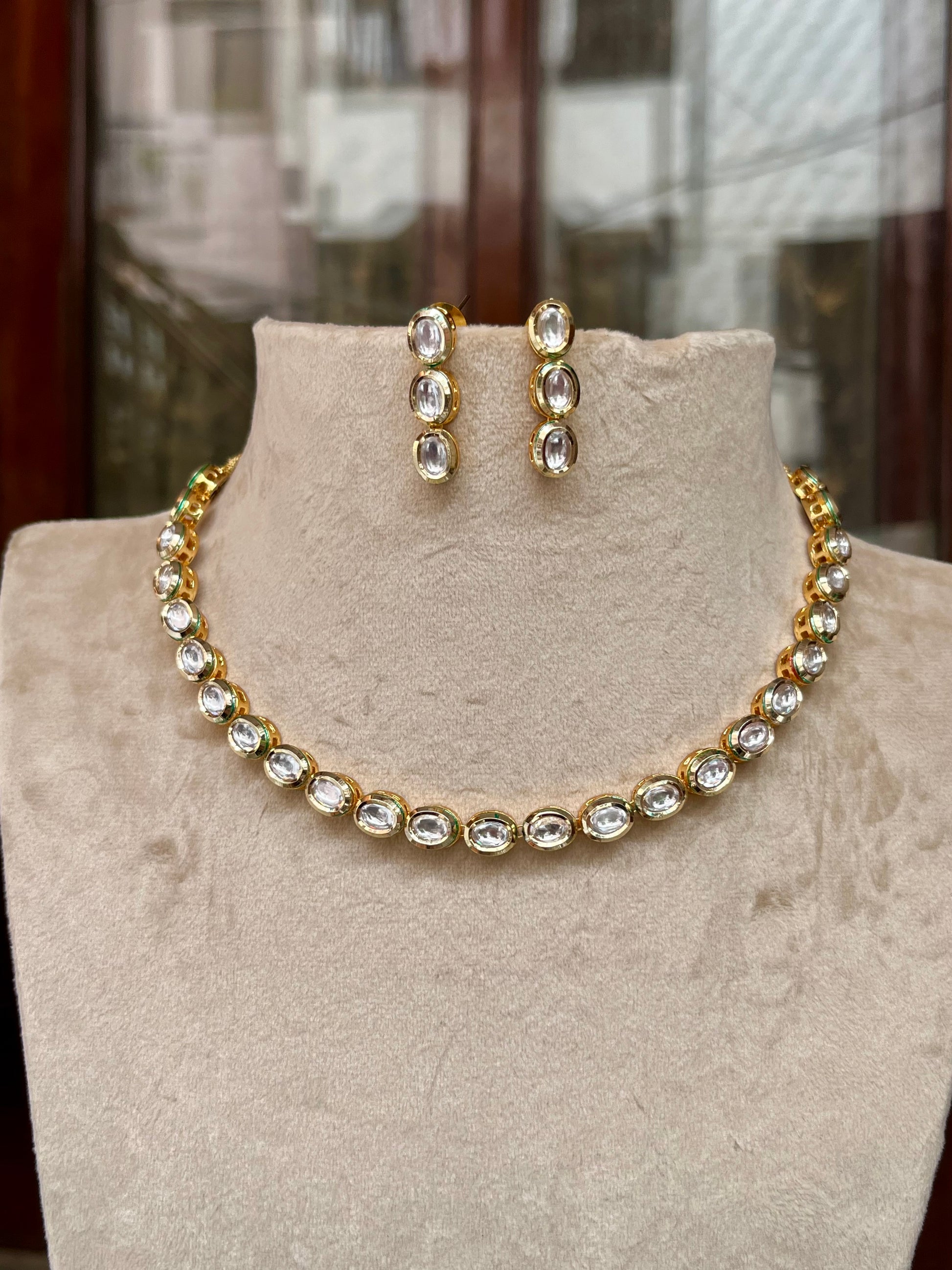 A traditionally handcrafted single-layer necklace set adorned with radiant Kundan stones, reflecting timeless royal elegance. Designed with precision and traditional flair, the set features a Dori closure for an adjustable fit. Paired with intricately crafted matching earrings, this ensemble is perfect for weddings, festive gatherings, and traditional ceremonies.